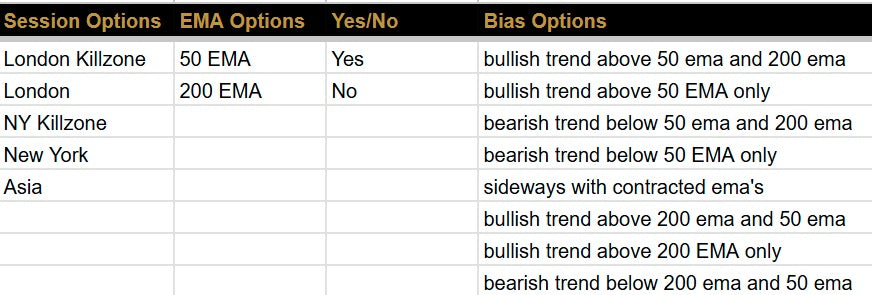 Edit timeframe bias options, sessions, assets and tags directly from the Options sheet.
