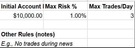 - Set account balance and risk parameters once in the Rules sheet and have them feed every position.