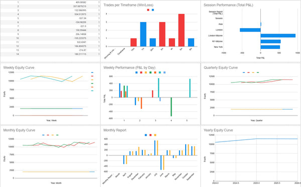 - Reports sheet for weekly, monthly, and quarterly performance, plus session and time-of-day breakdowns.