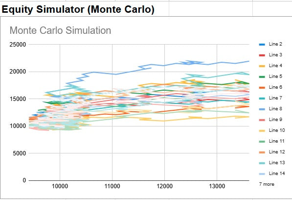 Run Monte Carlo-style simulations that generate multiple equity curves from your stats so you can see best, worst and median outcomes.
